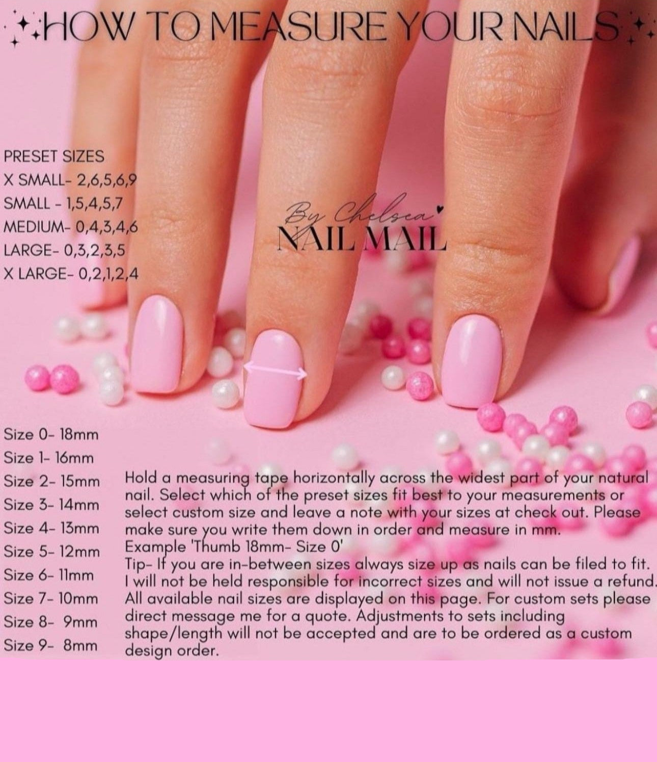Please measure your nails using my guide in the photo section and select which pre-set size fits best to your nails. Alternatively, If you select custom size please make sure to leave your measurements in the notes section at checkout in the right order. I will not be held responsible for incorrect sizes and I will not issue a refund.