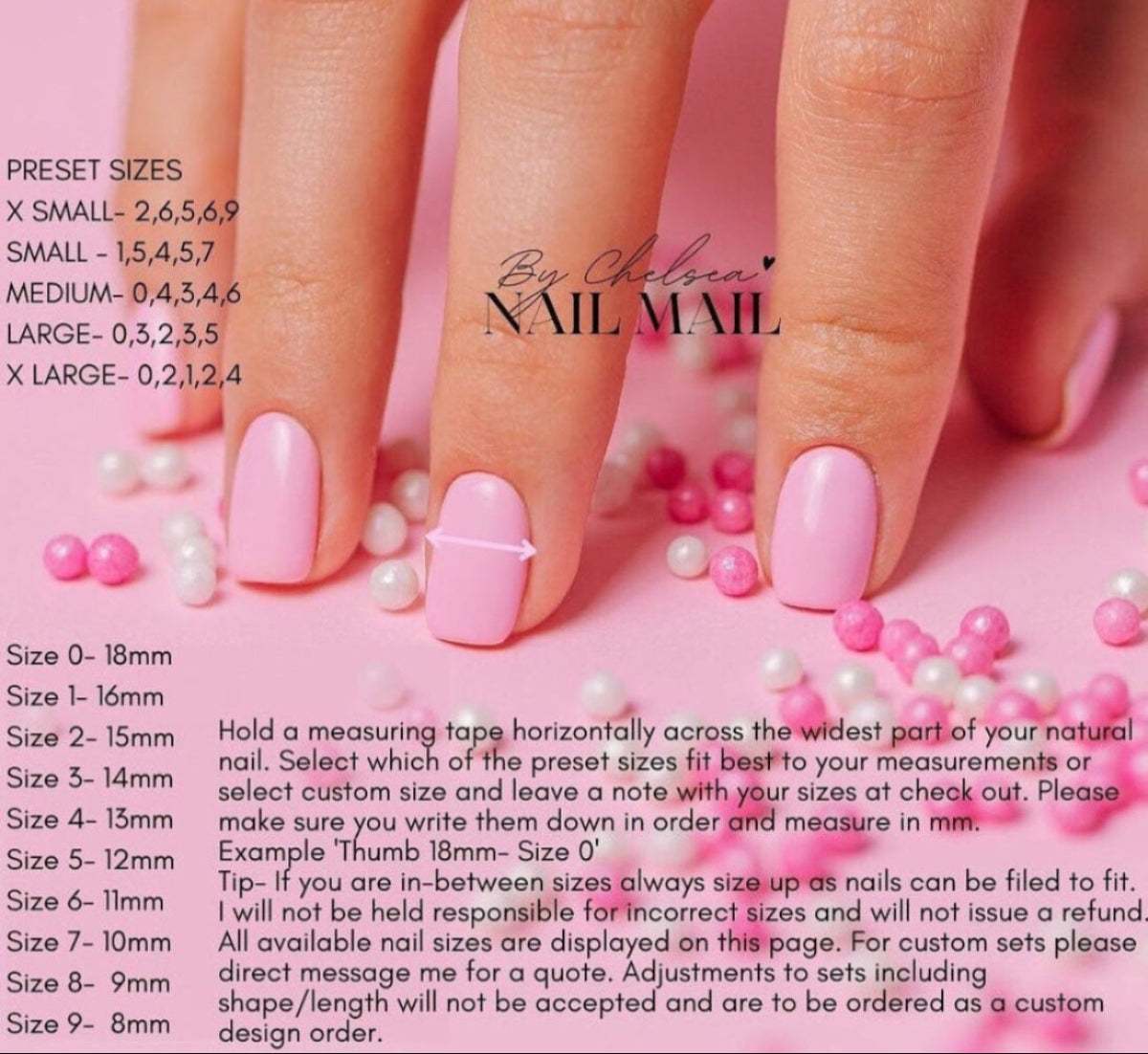 Please measure your nails using my guide in the photo section and select which pre-set size fits best to your nails. Alternatively, If you select custom size please make sure to leave your measurements in the notes section at checkout in the right order. I will not be held responsible for incorrect sizes and I will not issue a refund.